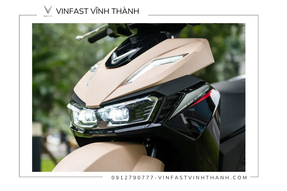 Phần đầu xe được thiết kế nổi khối rõ rệt, kết hợp cụm đèn LED projector dạng đôi đặt ngang, tạo cảm giác hiện đại và đầy uy lực. Dải đèn định vị ban ngày được tinh chỉnh mảnh mai, kéo dài theo chiều ngang, góp phần tăng tính nhận diện khi di chuyển trong đô thị đông đúc. Tổng thể phần đầu mang lại cảm giác tương lai, giống như các mẫu xe phân khối lớn thu nhỏ.