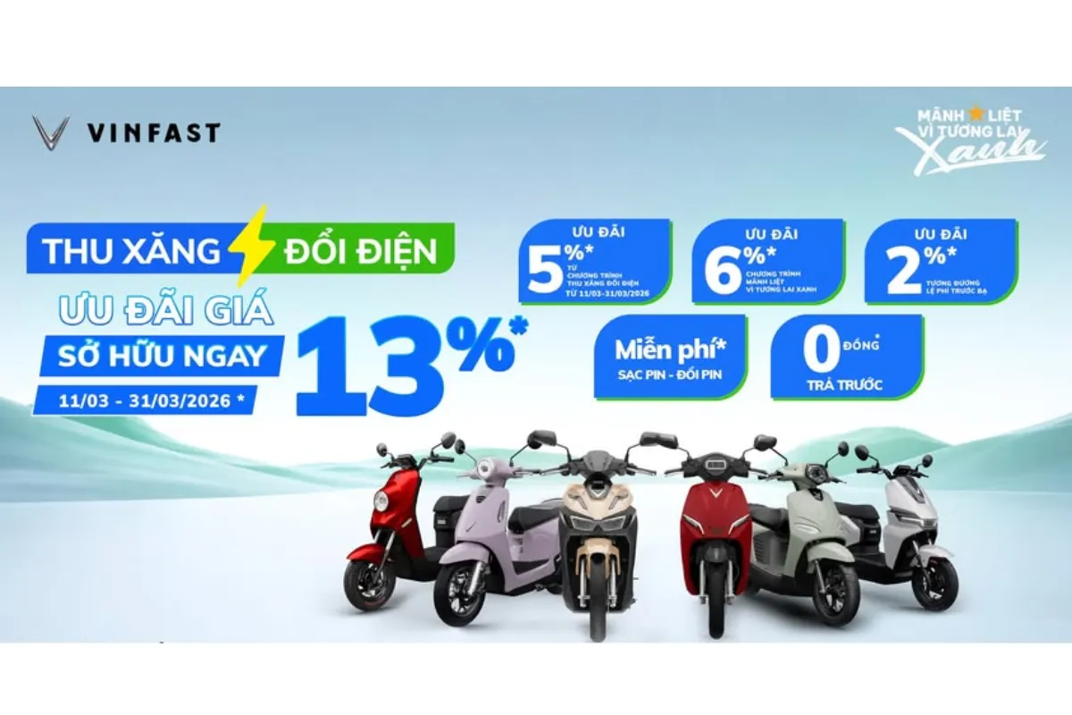 Theo thông tin công bố, chương trình “Thu xăng – Đổi điện” được triển khai trong thời gian từ ngày 11/3 đến hết ngày 31/3/2026. Đây là chương trình ưu đãi dành riêng cho những khách hàng đang sử dụng xe máy chạy xăng và muốn chuyển sang sử dụng xe máy điện VinFast.