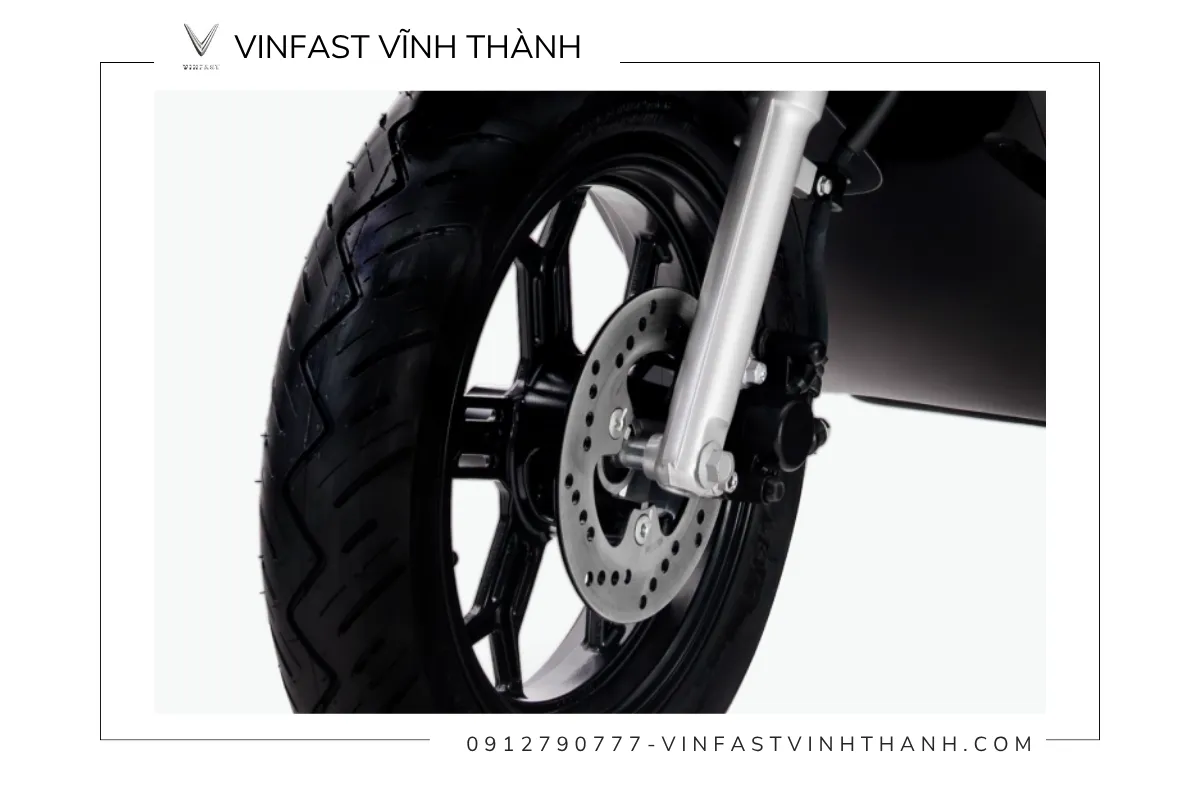 Xe sử dụng lốp không săm kích thước 90/90-12 cho cả bánh trước và bánh sau, kết hợp với phanh đĩa đơn phía trước và phanh cơ phía sau, đảm bảo khả năng kiểm soát tốt trong mọi tình huống. Tuy nhiên, do đặc điểm đặc trưng của xe máy điện là không có hộp số, người điều khiển cần chú ý khi thả phanh, đặc biệt là trên những đoạn đường có độ dốc, vì xe có thể bị “trôi nhẹ”. Đây là điều mà người mới sử dụng xe điện nên làm quen để đảm bảo an toàn.
