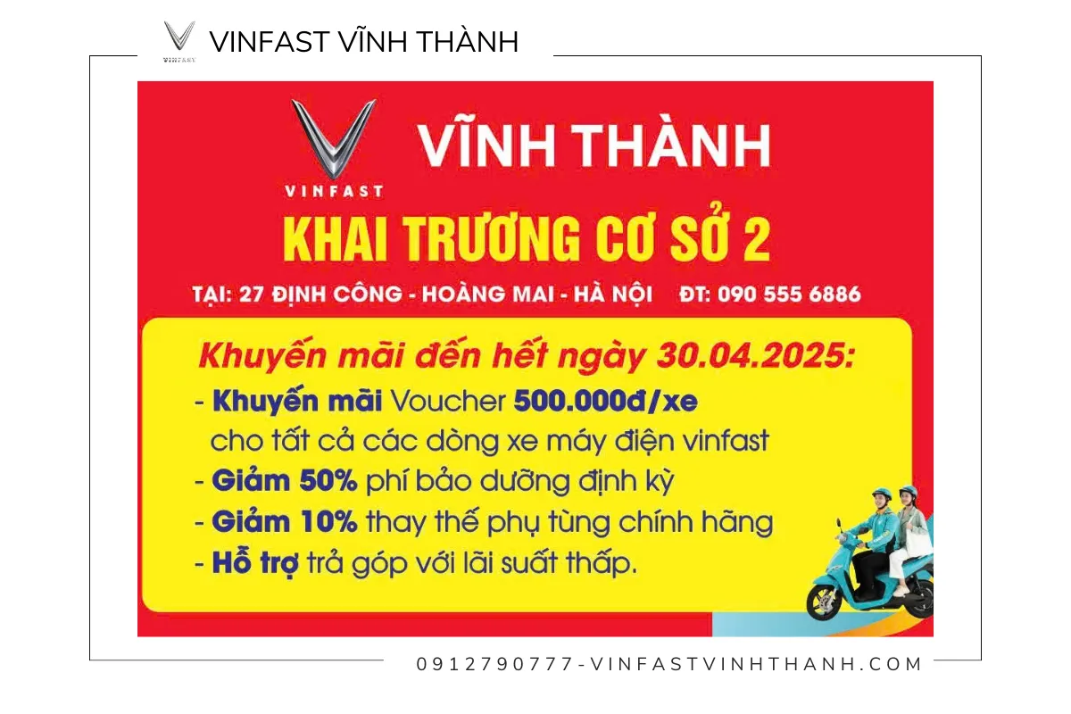 Nhằm đáp ứng nhu cầu ngày càng cao của khách hàng tại khu vực Hà Nội, đại lý VinFast Vĩnh Thành chính thức khai trương cơ sở 2 tại địa chỉ 27 Định Công, Hoàng Mai, Hà Nội. Tại cơ sở 2, VinFast Vĩnh Thành mang đến hàng loạt ưu đãi hấp dẫn dành cho khách hàng.